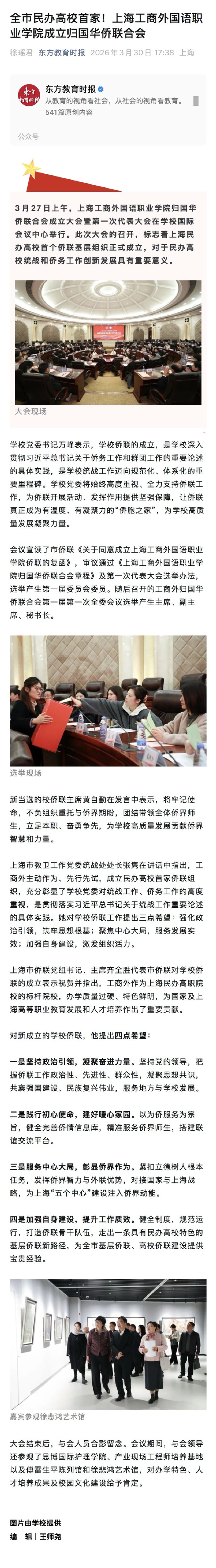 3月27日上午,上海工商外国语职业学院归国华侨联合会成立大会暨第一次代表大会在学校国际会议中心举行。此次大会的召开,标志着上海民办高校首个侨联基层组织正式成立,对于民办高校统战和侨务工作创新发展具有重要意义。